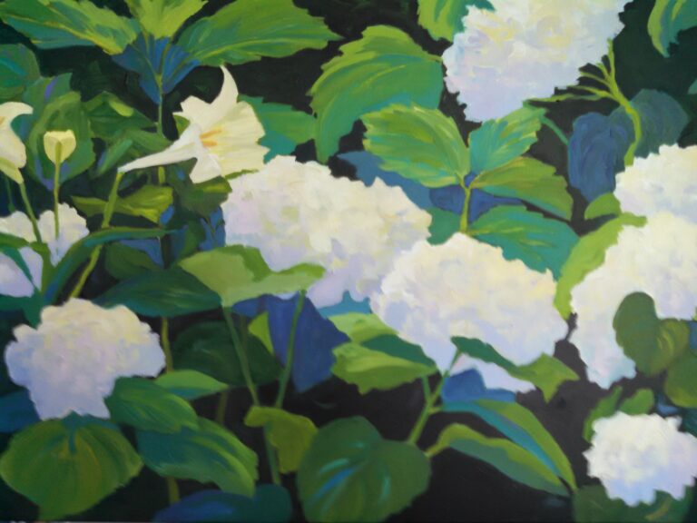 Painting of white hydrangeasWhite Hydrangeas, 24x26 acrylic on canvas, SOLD